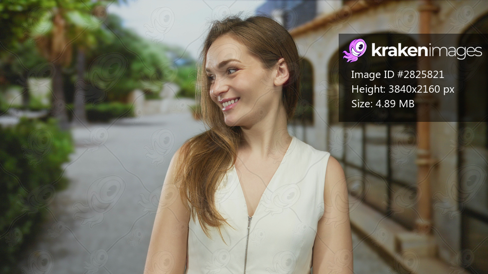 Young woman smiling in white dress on sunlit cobblestone street by arched building windows; happiness.