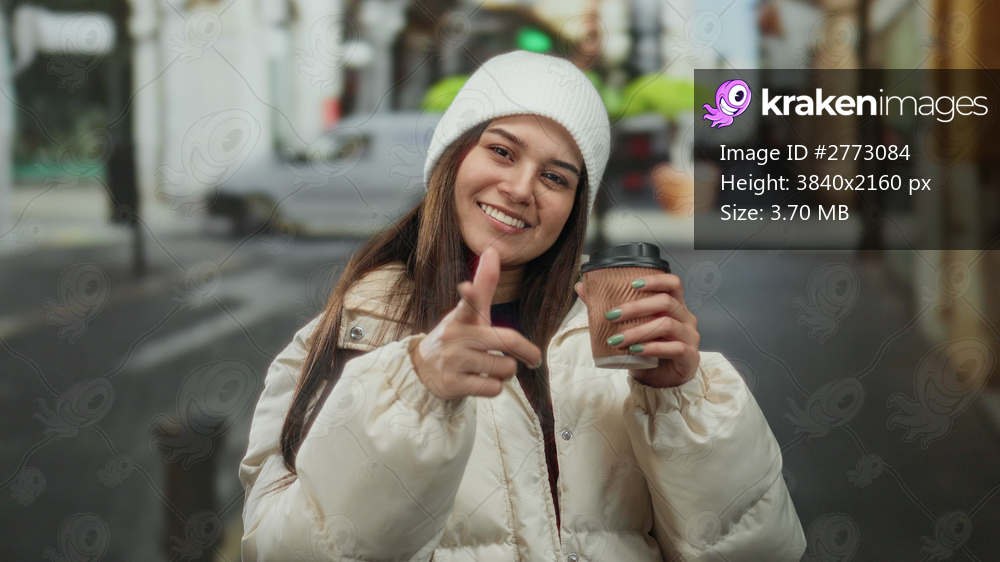 Young woman smiling in winter attire holding coffee on a city street with blurred background, highlighting outdoor urban setting.