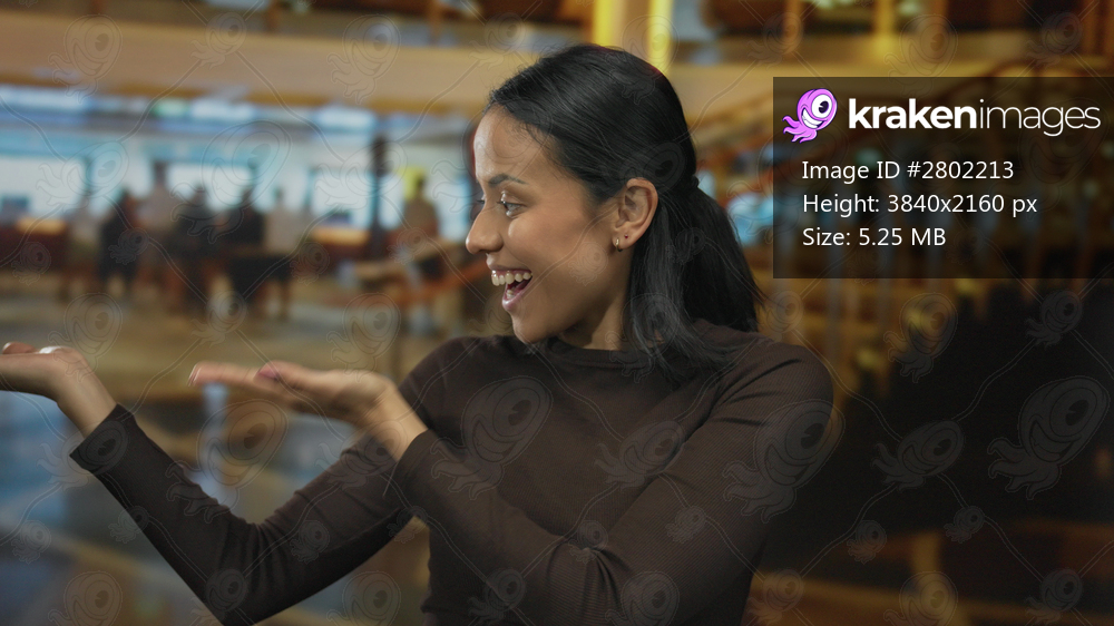 Young woman smiling indoors at hotel showcasing open palms with vibrant background suggesting lively social atmosphere.