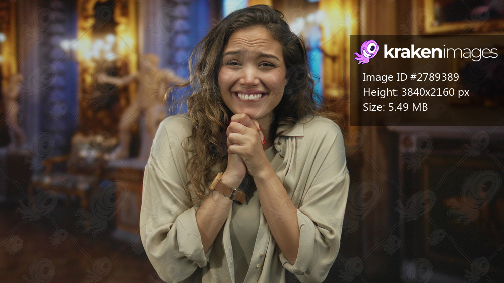 Young woman smiling indoors at museum with art sculptures in background, expressing joy and admiration, showcasing a candid moment of emotion and culture. - Kraken Images