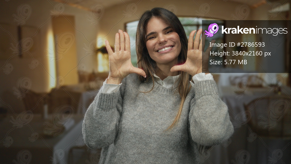 Young woman smiling indoors in a cozy living room, wearing a gray sweater, exuding joy and warmth, set against a softly lit interior, showcasing a friendly and inviting atmosphere. - Kraken Images