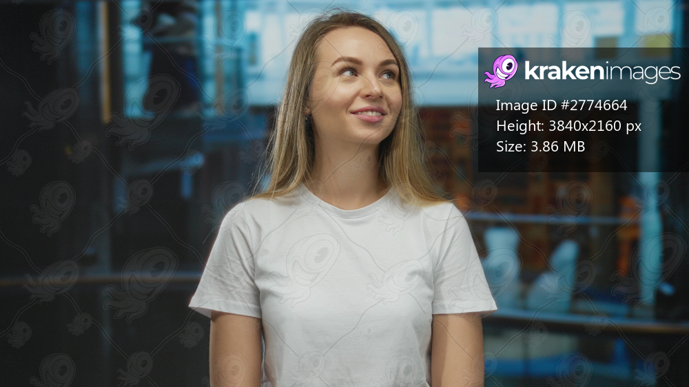 Young woman smiling indoors in a hotel setting, wearing a white shirt, capturing a moment of happiness and calm while looking to the side.