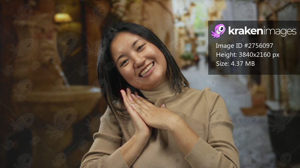 Young woman smiling joyfully outdoors on a busy city street backdrop, expressing gratitude with hands clasped near her chest, surrounded by warm urban atmosphere. - Kraken Images