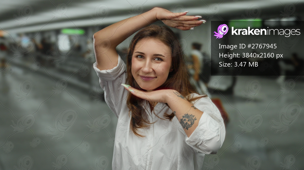 Young woman smiling making frame gesture with hands in bustling airport terminal surrounded by travelers and suitcases showcasing vibrant tattoo and casual fashion indoors - Kraken Images