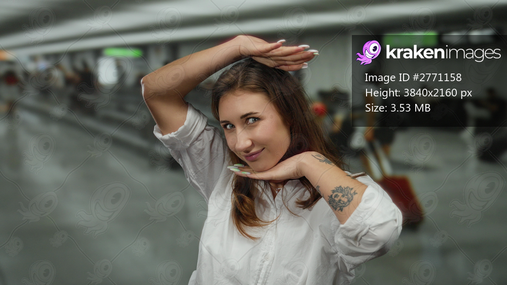 Young woman smiling making frame gesture with hands in bustling airport terminal surrounded by travelers and suitcases showcasing vibrant tattoo and casual fashion indoors - Kraken Images