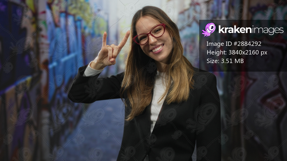 Young woman smiling and making rock horns with her hand while wearing red glasses in a graffiti street alley; playful confidence.