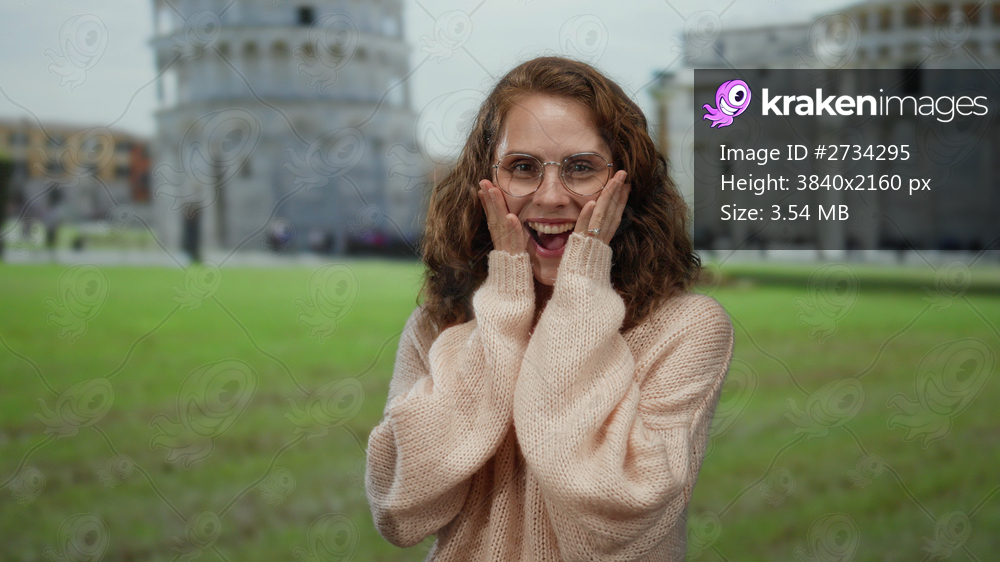 Young woman smiling near pisa tower in italy, wearing glasses and sweater on a bright outdoor day, capturing european architecture and joyful travel ambiance. - Kraken Images