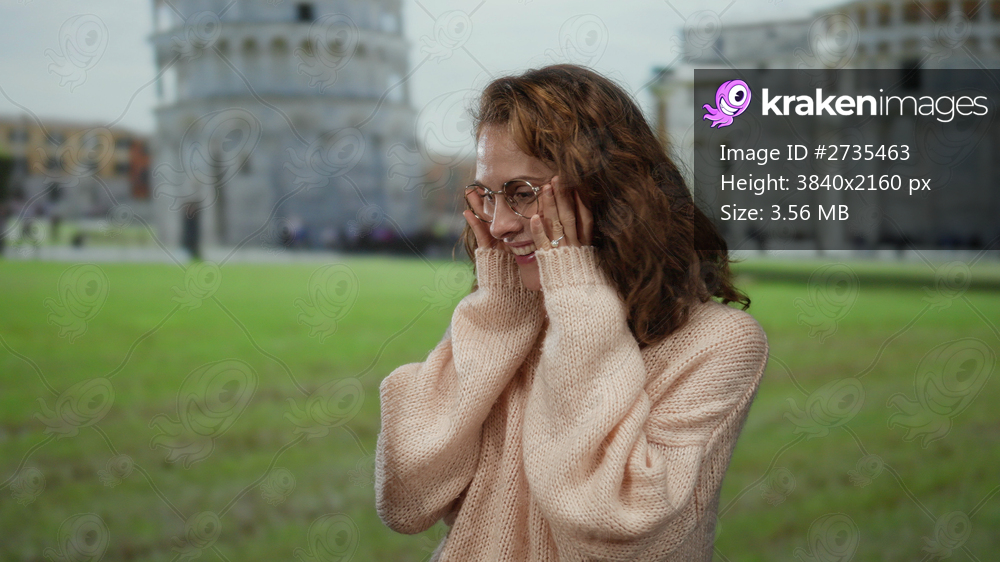 Young woman smiling near pisa tower in italy, wearing glasses and sweater on a bright outdoor day, capturing european architecture and joyful travel ambiance. - Kraken Images