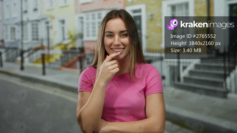 Young woman smiling on a colorful residential street outdoors in casual pink shirt with arms crossed, conveying happiness and confidence in urban environment. - Kraken Images