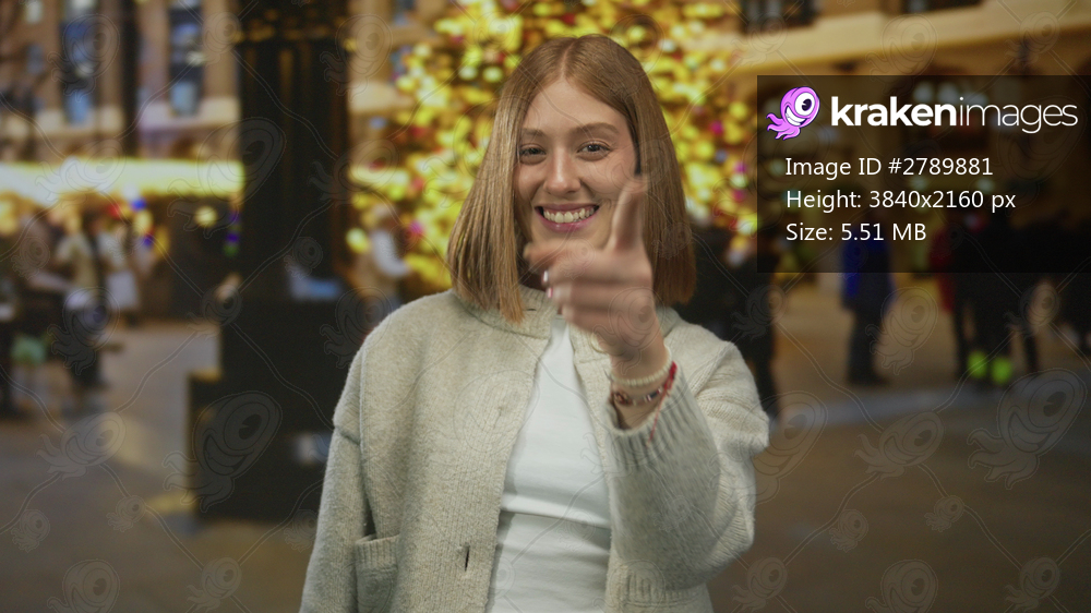 Young woman smiling on a festive street at night surrounded by urban lights in a vibrant city setting with people in the background during the holidays - Kraken Images