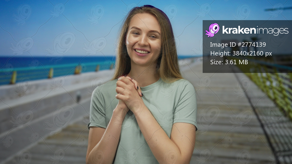 Young woman smiling on a sunny promenade by the sea with clear blue water, wearing casual clothing and enjoying the serene outdoor atmosphere.