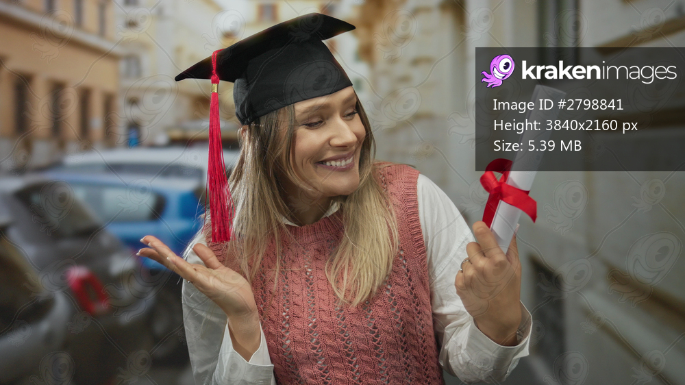 Young woman smiling on city street holding diploma wearing graduation cap symbolizing achievement and success outdoors