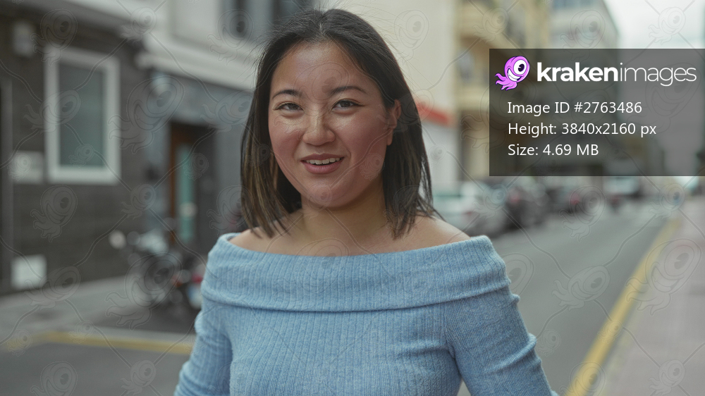 Young woman smiling on city street with modern buildings around in an urban setting, captured outdoors showcasing casual clothing in a vibrant metropolitan atmosphere. - Kraken Images