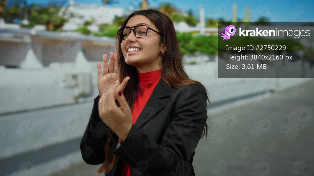 Young woman smiling on street wearing glasses and red clothing, gesturing excitedly against a vibrant outdoor backdrop.