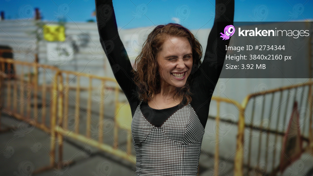 Young woman smiling outdoors at a construction site with fences and corrugated metal background under blue sky.