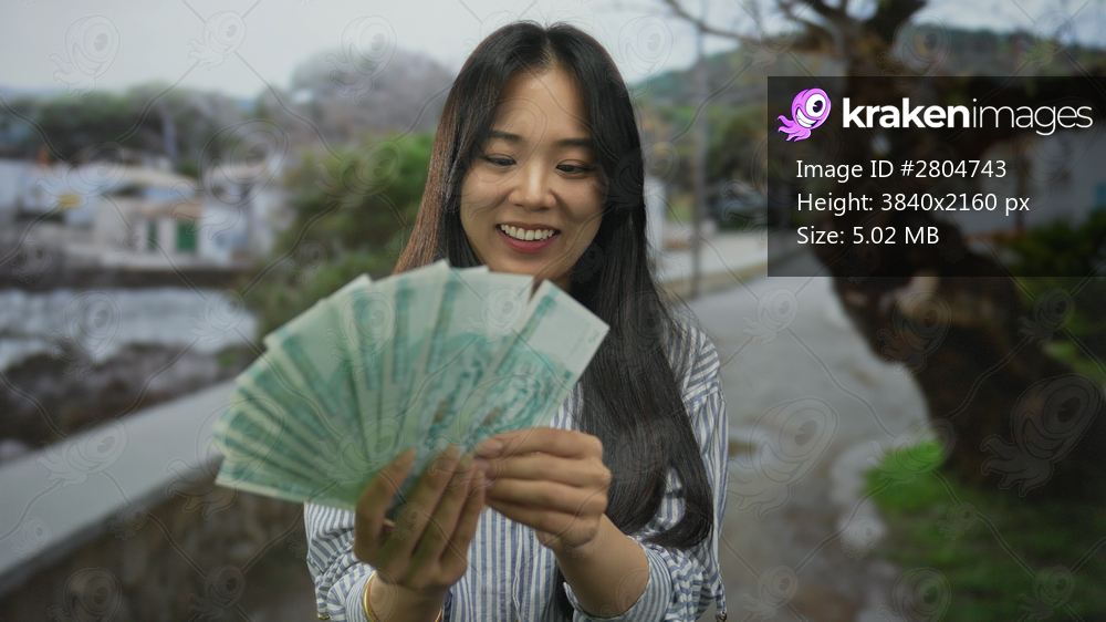 Young woman smiling outdoors holding chinese yuan banknotes on a seaside promenade with a backdrop of trees and buildings in a peaceful setting.
