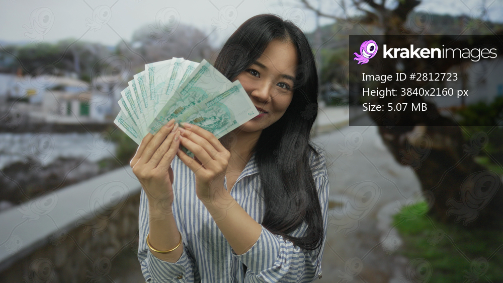Young woman smiling outdoors holding chinese yuan banknotes on a seaside promenade with a backdrop of trees and buildings in a peaceful setting.