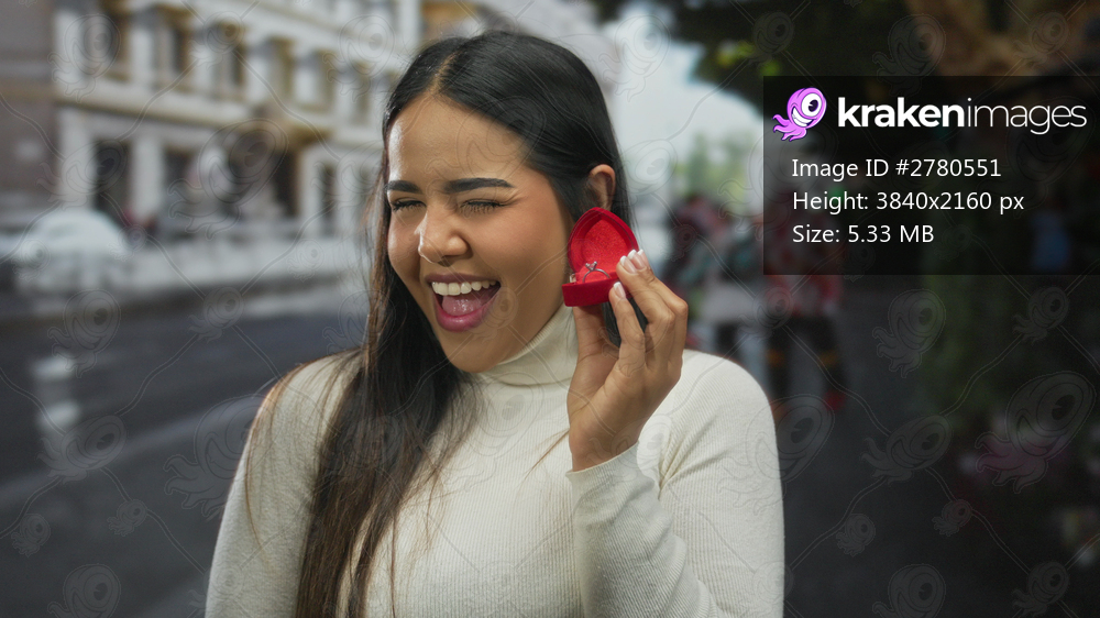 Young woman smiling outdoors holding engagement ring in a red box on a city street showcasing happiness and love