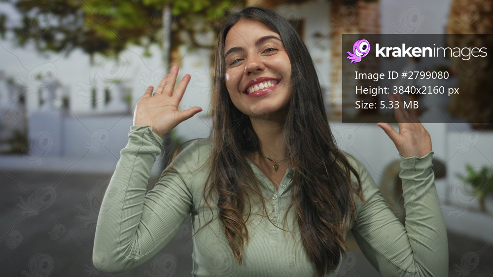 Young woman smiling outdoors in charming urban area with trees and traditional architecture nearby she embodies happiness and casual fashion in public setting - Kraken Images