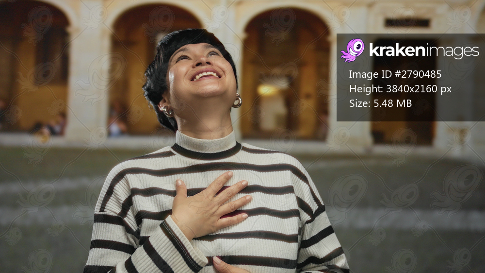 Young woman smiling outdoors in front of historic building wearing striped sweater with short hair and earrings, capturing joyful cultural travel experience in urban environment. - Kraken Images
