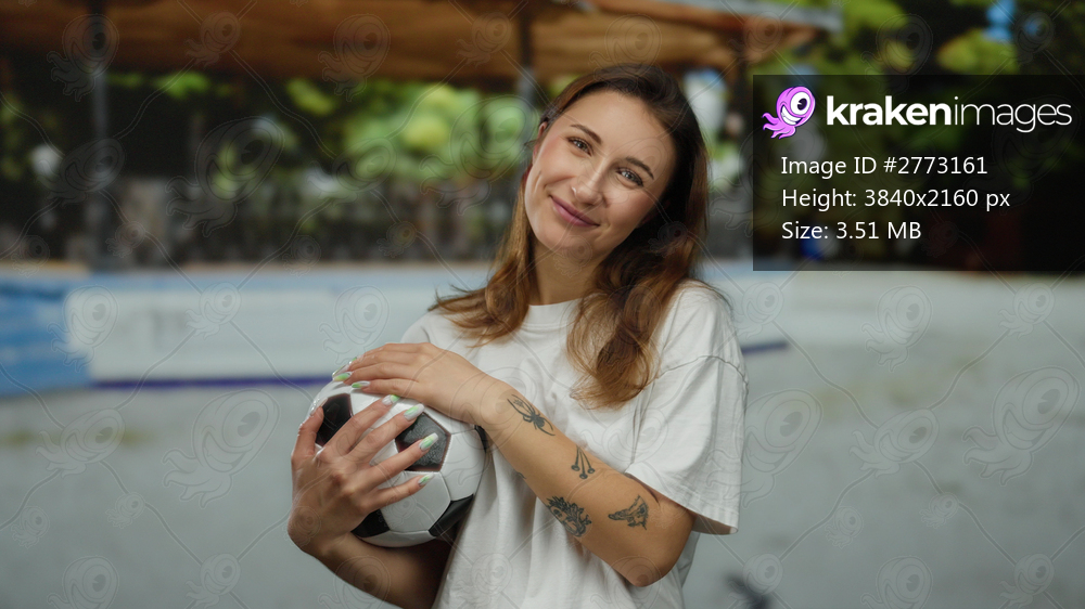 Young woman smiling outdoors in park holding soccer ball wearing white shirt with tattoos visible against blurred green background showcasing joy and sport. - Kraken Images