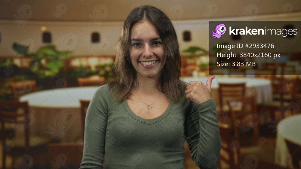 Young woman smiling and pointing thumb toward round restaurant tables in building; friendly confidence.