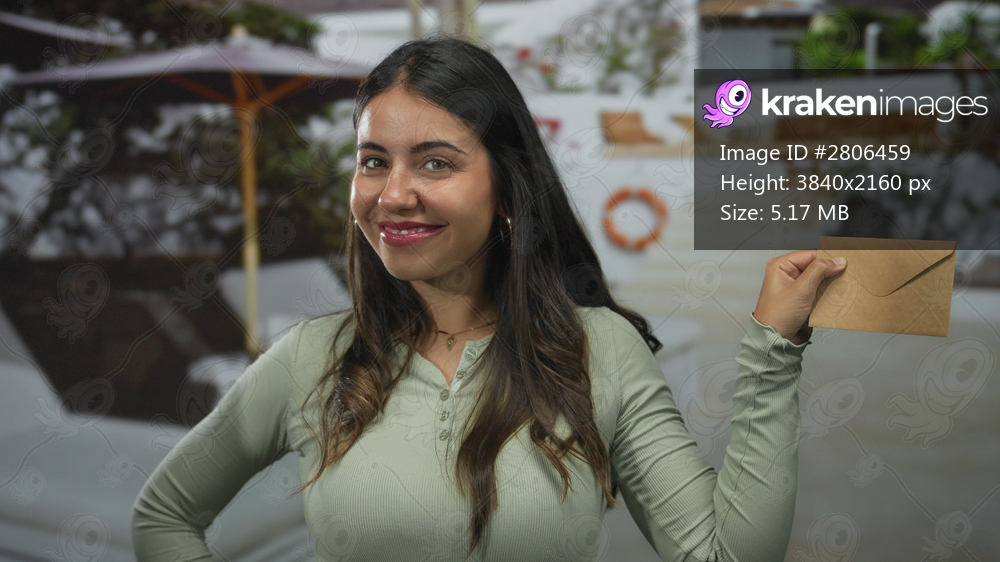 Young woman smiling points finger to envelope on street outside building; invitation excitement message.