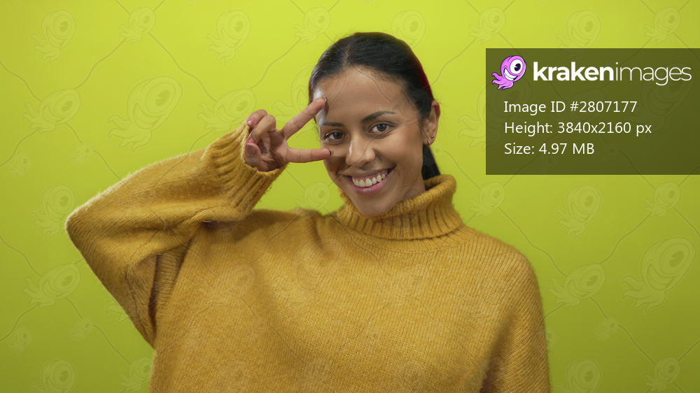 Young woman smiling and posing with a peace sign wearing a cozy sweater against a vibrant yellow background in a cheerful and playful manner.
