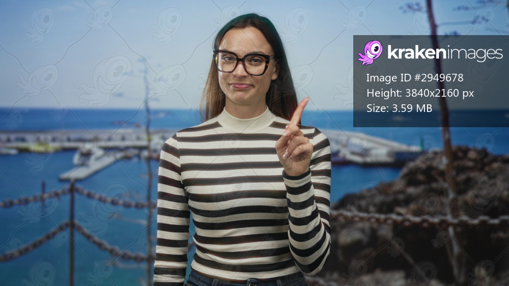 Young woman smiling and showing a peace sign with her hand at a port pier beside moored boats, wearing striped top and glasses; playful leisure.