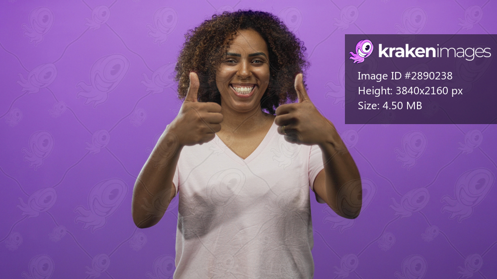 Young woman smiling and showing thumbs up in purple studio while wearing light pink v neck shirt; happiness approval confidence.