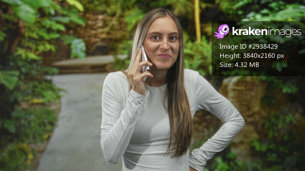 Young woman smiling and talking on smartphone with hand on head on a garden path surrounded by lush plants; joyful ease.