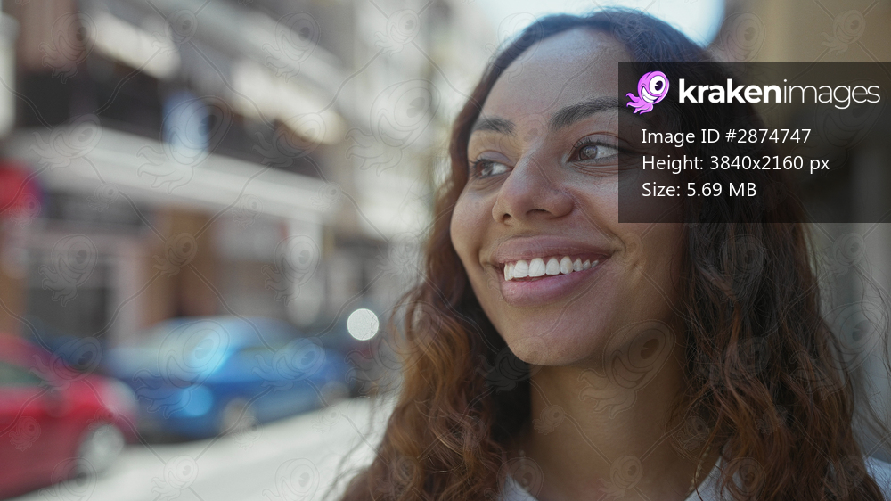 Young woman smiling with teeth and closed eyes in closeup on a sunny city street with parked cars and buildings; joy youth.