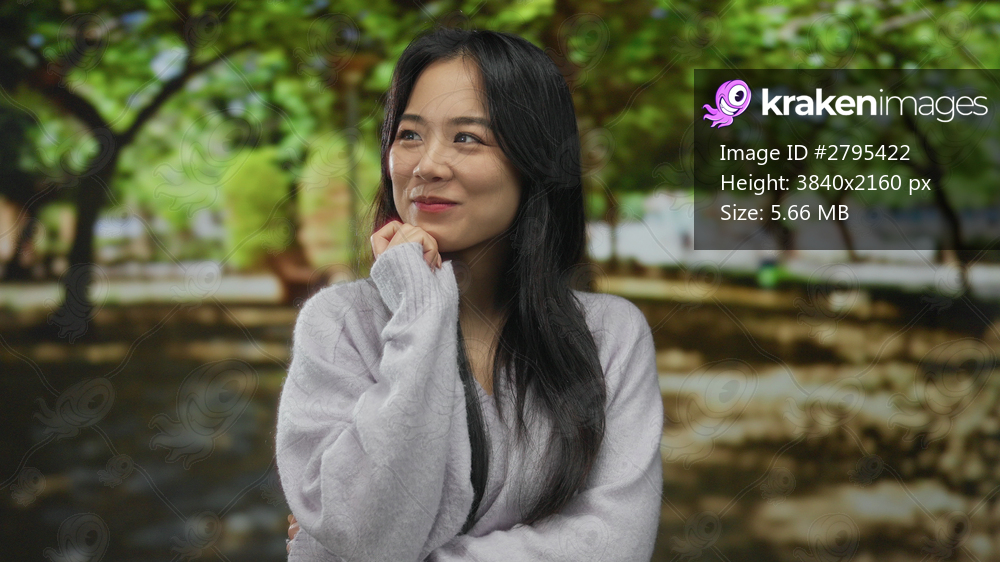 Young woman smiling thoughtfully in a green park, surrounded by lush outdoor scenery.