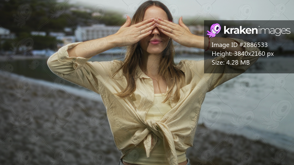 Young woman smiling, touching hair and covering eyes on a sandy beach by the seaside; carefree summer joy.