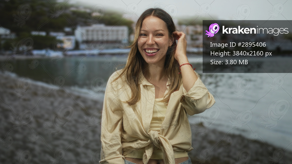 Young woman smiling, touching hair and covering eyes on a sandy beach by the seaside; carefree summer joy.