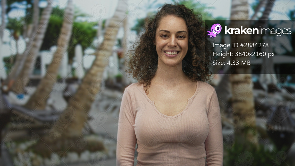 Young woman smiling with visible chest and relaxed posture by a hotel building with palm trees and lounge chairs; happiness relaxation vacation.