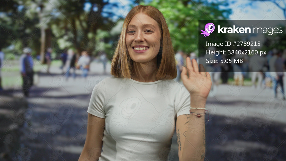 Young woman smiling and waving outdoors in an urban setting with people and trees in the background on a sunny day