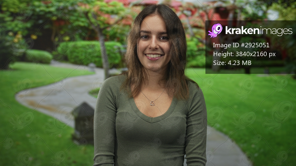 Young woman smiling and wearing a heart necklace on a park path with green lawn and trimmed shrubs in a forest setting; serenity nature.