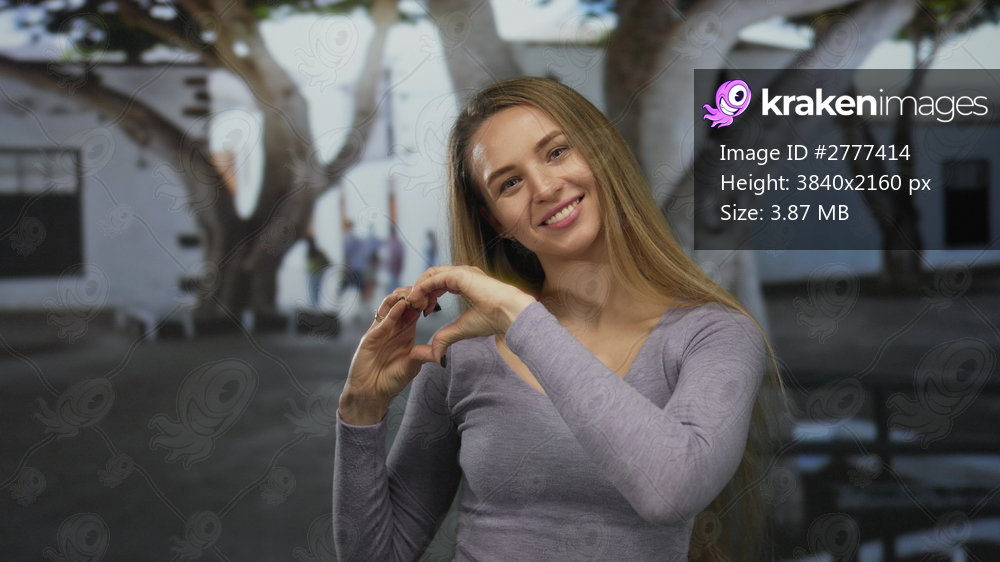 Young woman smiling while forming a heart shape with her hands on a city street, surrounded by trees, capturing the essence of joy and outdoor urban life in a vibrant setting - Kraken Images