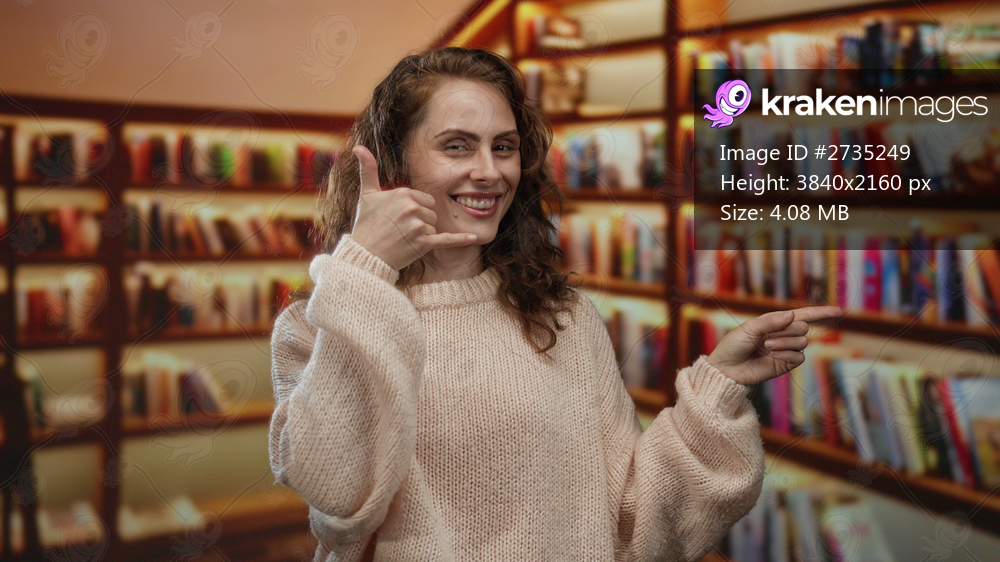 Young woman smiling while gesturing a phone call in a cozy sweater stands in a library surrounded by colorful books on wooden shelves indoor.