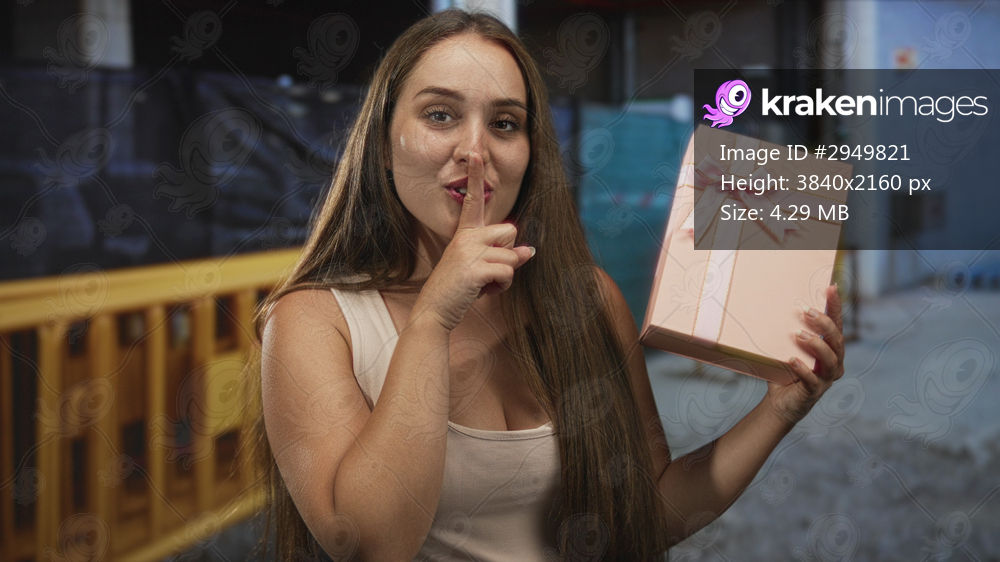 Young woman smiling while holding a pink gift box and finger to lips for silence beside yellow barrier at building construction area; playful secret.