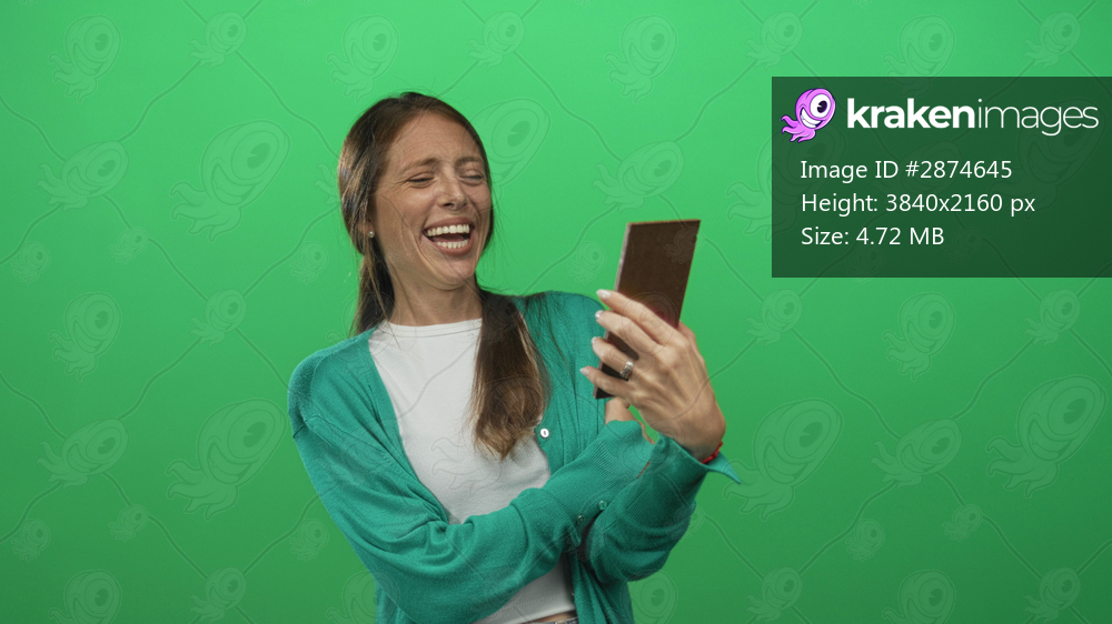 Young woman smiling while holding phone with hand to cheek and leaning forward in green studio set looking at the device; joy candid.