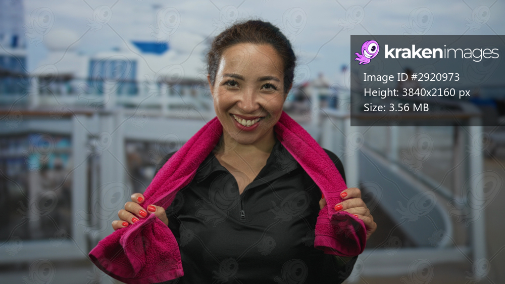 Young woman smiling while holding pink towel over her shoulders on a cruise ship deck railing under daylight sky; joy relaxation.