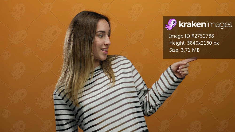 Young woman smiling while pointing and making a phone gesture against an isolated orange wall background, capturing an expressive moment.