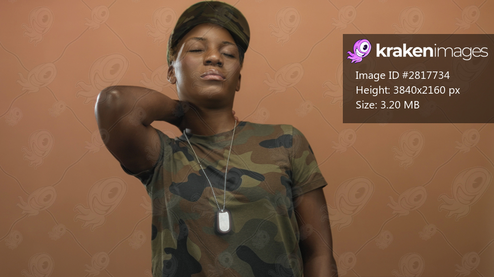 Young woman soldier wearing camouflage uniform, cap, and dog tags touches neck in peach studio; pride duty.
