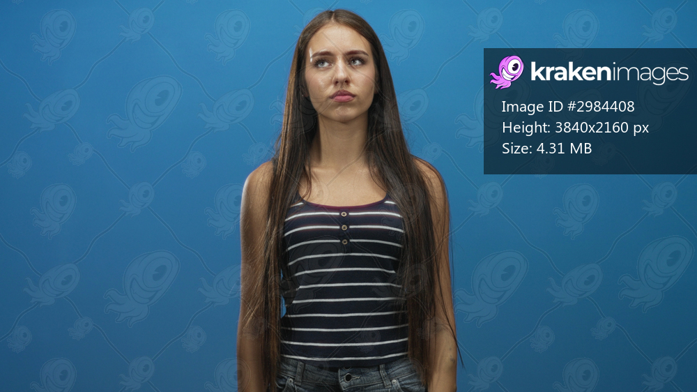 Young woman standing with arms at sides, eyes closed and lips pouting, long hair, striped tank top and jeans against a blue studio backdrop; boredom.