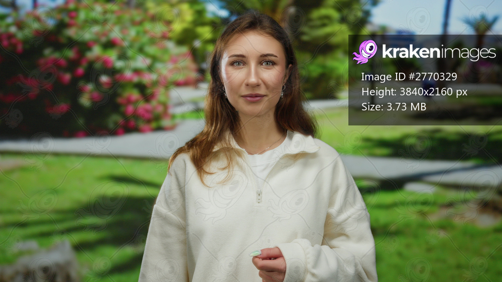 Young woman standing in a sunny outdoor park with blooming flowers and lush greenery, wearing a casual white sweater, enjoying a peaceful afternoon in nature. - Kraken Images