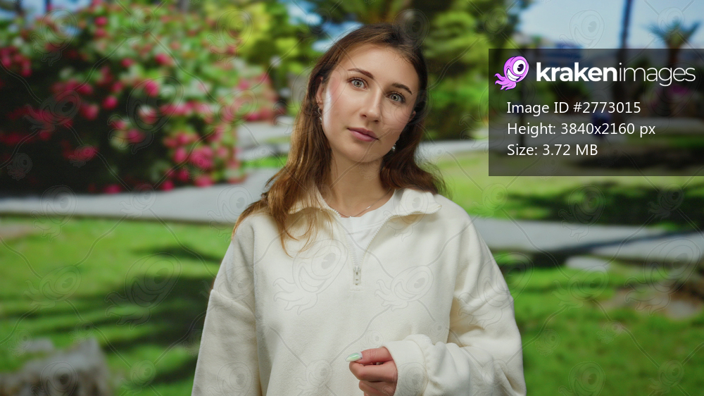 Young woman standing in a sunny outdoor park with blooming flowers and lush greenery, wearing a casual white sweater, enjoying a peaceful afternoon in nature. - Kraken Images