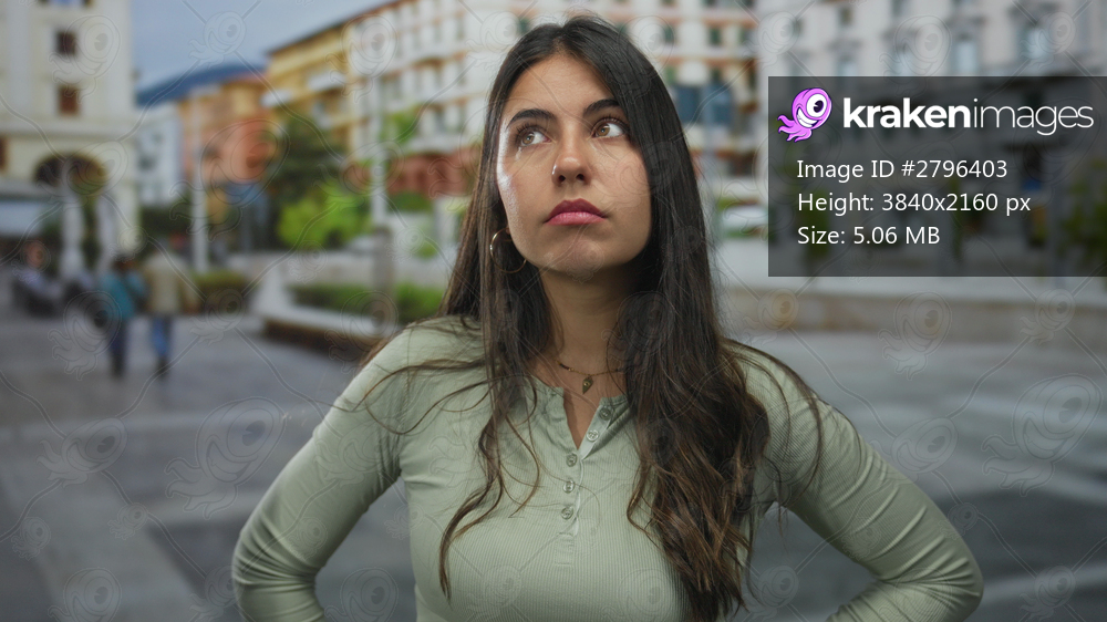 Young woman standing in a vibrant urban street setting, showcasing thoughtful expression surrounded by textured architecture and soft natural light.
