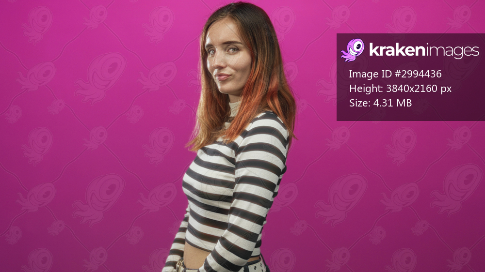 Young woman standing in profile wearing a black and white striped shirt and belt against a bright pink studio backdrop; calm introspection.
